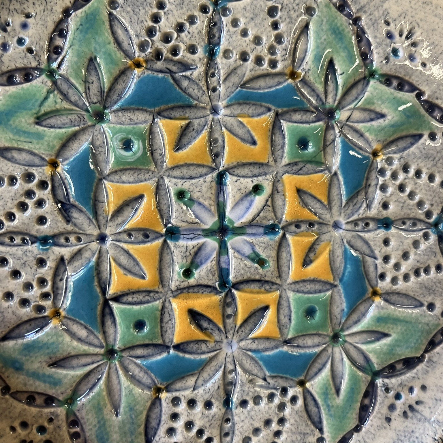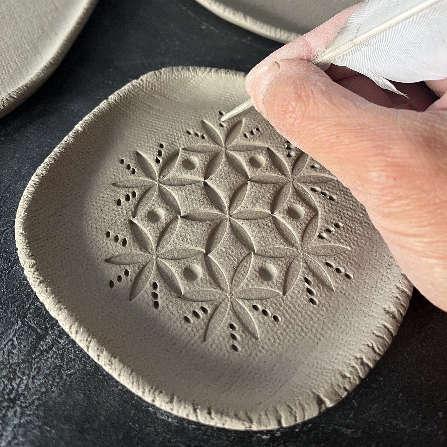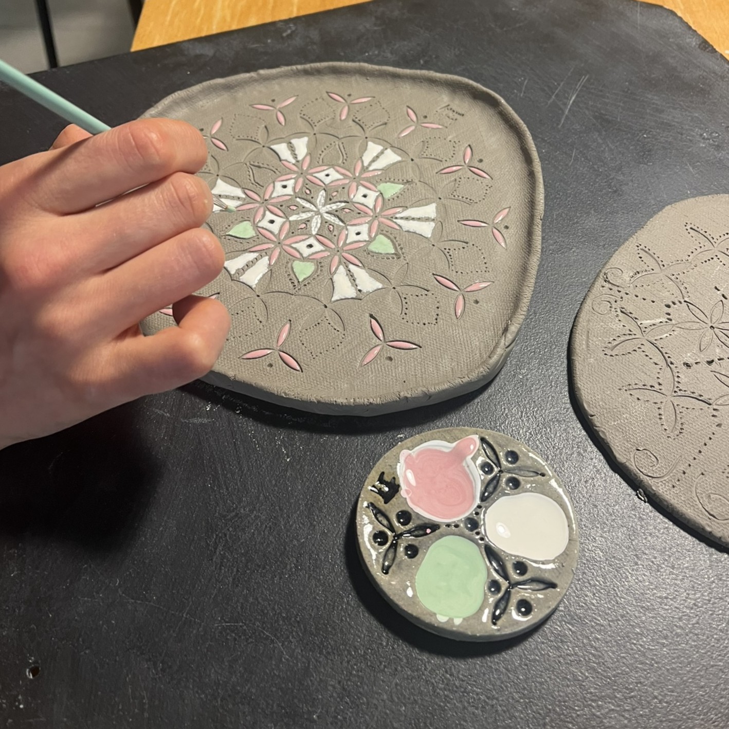 This is a relaxation pottery workshop, where we will leave common day thoughts behind and we will dive into the process of making a mandala on a plate. Step by step and stamp by stamp we will be looking for our structure and rhythm and imprint it into soft clay. And when done, we will dive into our picture once more with colour and leaf by leaf, line by line, dot by dot we will give our picture colour - life, if you may. The plate will be glazed and fired afterwards and ready for handover within 2-3 weeks time.